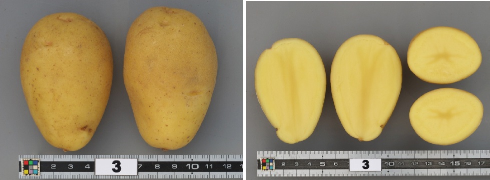 特性いもの形は長卵形、塊茎の目の数はかなり少、塊茎の皮色は淡ベージュ、塊茎の目の基部の色は赤、塊茎の表皮のネットはかなり少、塊茎の肉色は黄、上いも重はやや軽、上いも数はかなり多、上いもの平均重は軽である。