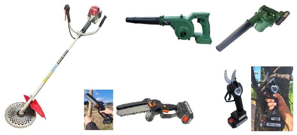 画像左:エンジン式刈払機、上右:充電式ブロワー、下右:充電式枝切ばさみ
